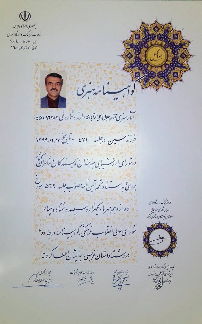 گواهینامه درجه دو هنری در رشته داستان‌نویسی به جلال توکلی نویسنده یزدی اعطا شد.