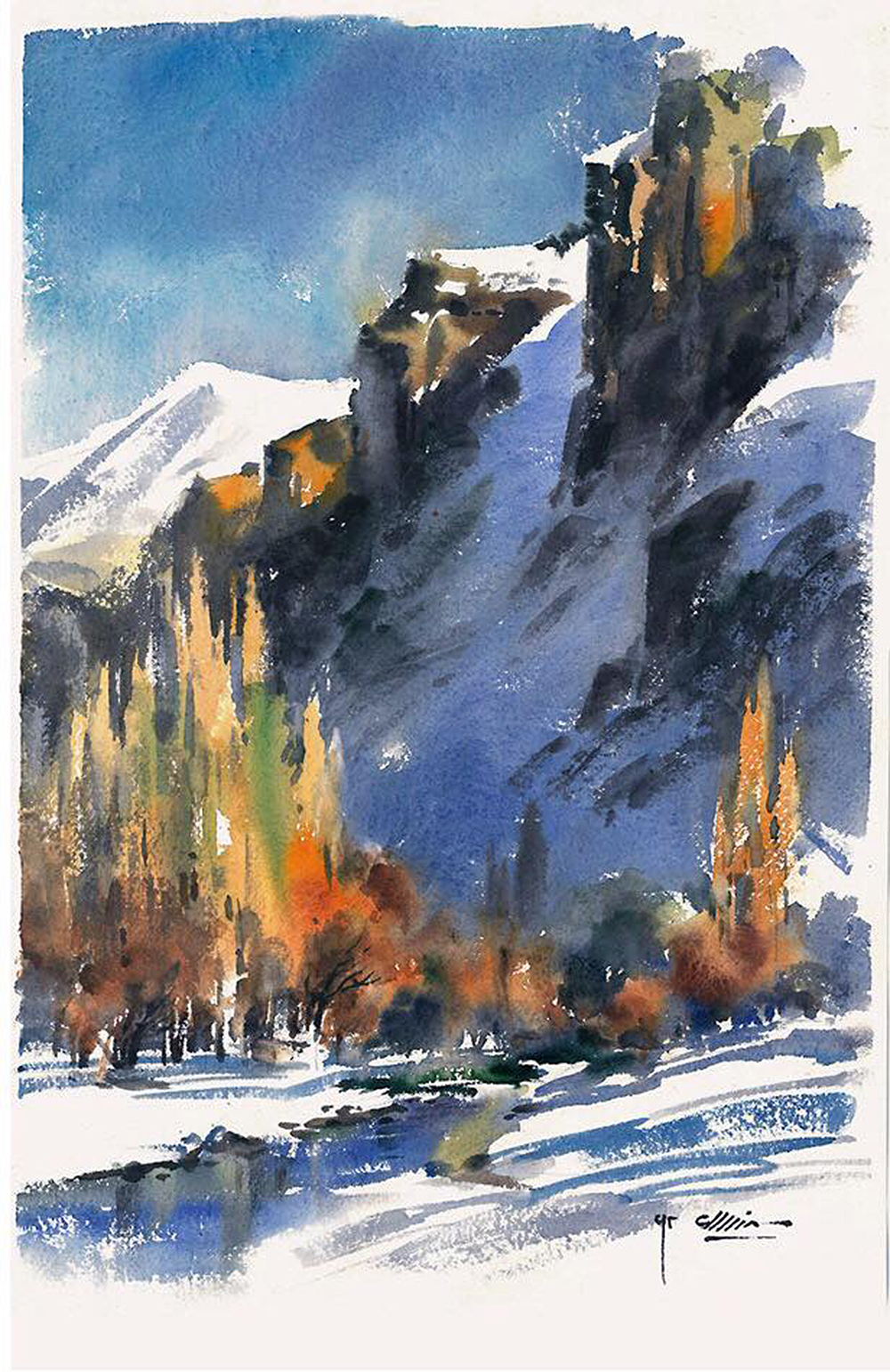 «از دورانی که در هـنرستان اصفهان مشغول به تحصیل هنر بودم به آبرنگ علاقهمند شدم و از همان سالها به آموختن این شیوه از نقاشی پرداختم،دیدن آثار استادانی چون یرواند و سمبات در این راه برایم بسیار سودمند بود.در مورد آبرنگ باید گفت که تکنیک آبرنگ در نقاشی از مشکلترین تـکنیکهاست.در ایـن روش هر قدر تعداد قلم(تاش)روی اثر کمتر باشد،کیفیت آن بهتر خواهد بود.در آبرنگ،نقاش نمیتواند چیزی را در حین نقاشی عوض و یا از بین ببرد، پس یک تصمیم و تفکر اولیه بـاید کـاملا منطقی و حساب شده باشد.البته منظورم از منطقی و حساب شده رد احساس در این شیوه نیست،بلکه تمام این موارد که اصولا فنون کار به شمار میروند در استحالهای از احساس هنرمند شکل میگیرند و سپس روی صفحه نقش میبندند».