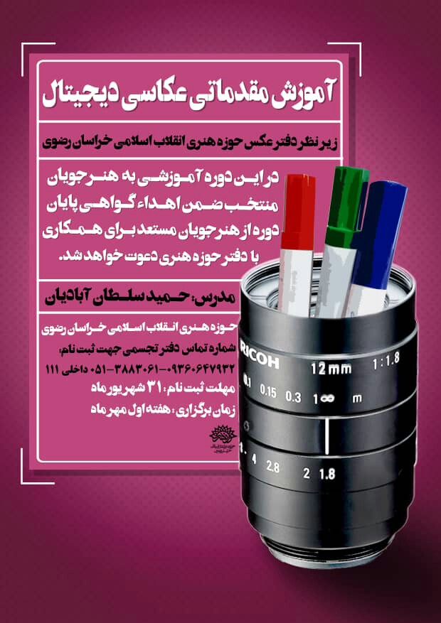به گزارش واحد خبر روابط عمومی حوزه هنری انقلاب اسلامی خراسان رضوی، این دوره آموزشی با تدریس حمید سلطانآبادیان از عکاسان مطرح مشهد، مباحث مختلفی همچون نگاهی به تاریخ عکاسی در ایران و جهان، آشنایی با انواع دوربینهای عکاسی و قطعات دوربین، شناخت کادر و مقدمهای بر ترکیببندی و نورسنجی در عکاسی، ویرایش عکس با نرمافزار فتوشاپ و لایت روم در سطح مقدماتی و آشنایی با عکاسان مطرح ایران و جهان را شامل میشود.